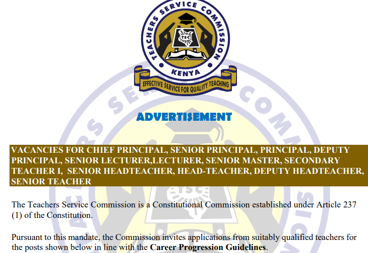 VACANCIES FOR CHIEF PRINCIPAL, SENIOR PRINCIPAL, PRINCIPAL, DEPUTY PRINCIPAL, SENIOR LECTURER,LECTURER, SENIOR MASTER, SECONDARY TEACHER I,  SENIOR HEADTEACHER, HEAD-TEACHER, DEPUTY HEADTEACHER, SENIOR TEACHER